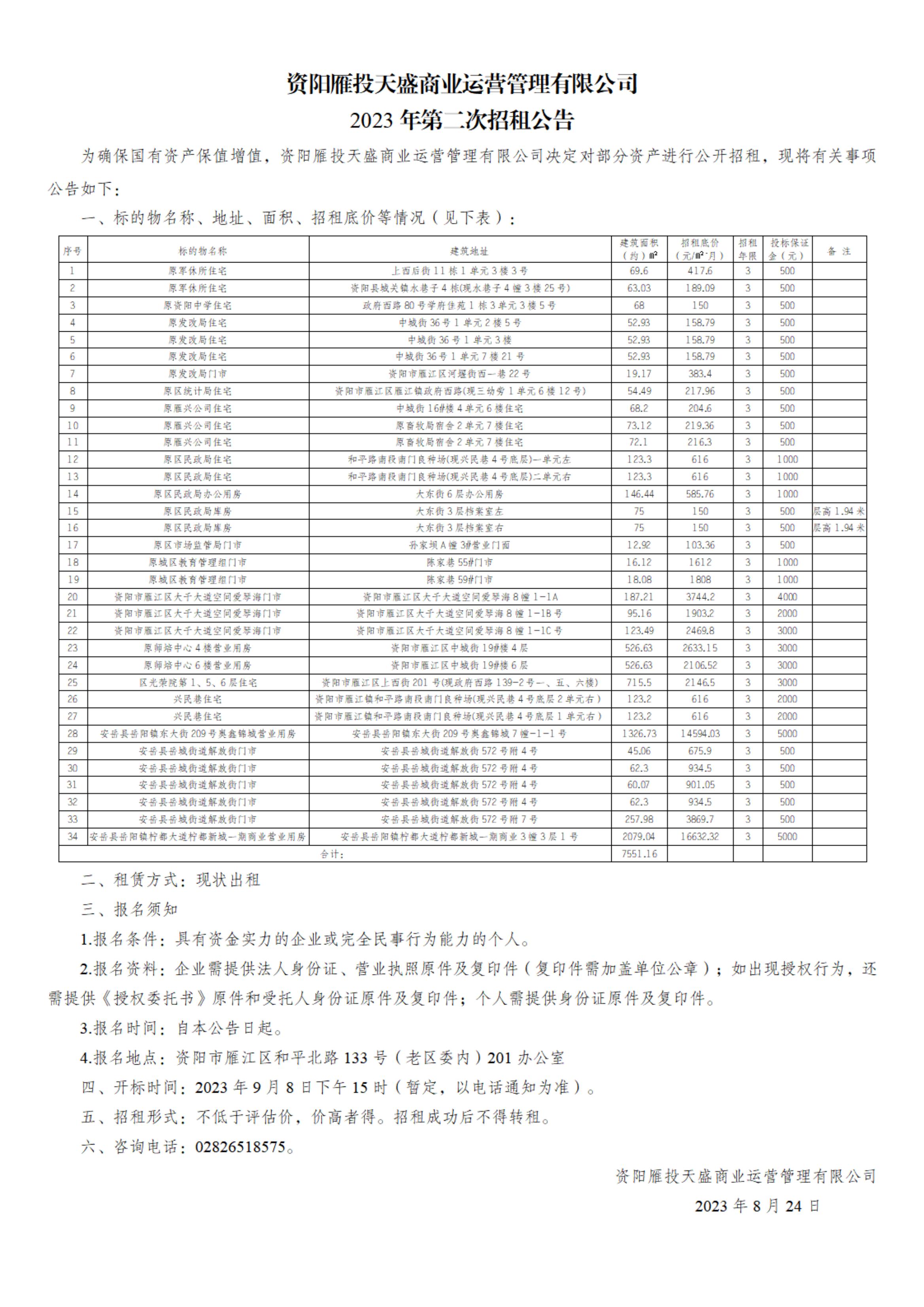 為確保國(guó)有資產(chǎn)保值增值,資陽(yáng)雁投天盛商業(yè)運(yùn)營(yíng)管理有限公司決定對(duì)部分資產(chǎn)進(jìn)行公開(kāi)招租,現(xiàn)將有關(guān)事項(xiàng)公告如下: